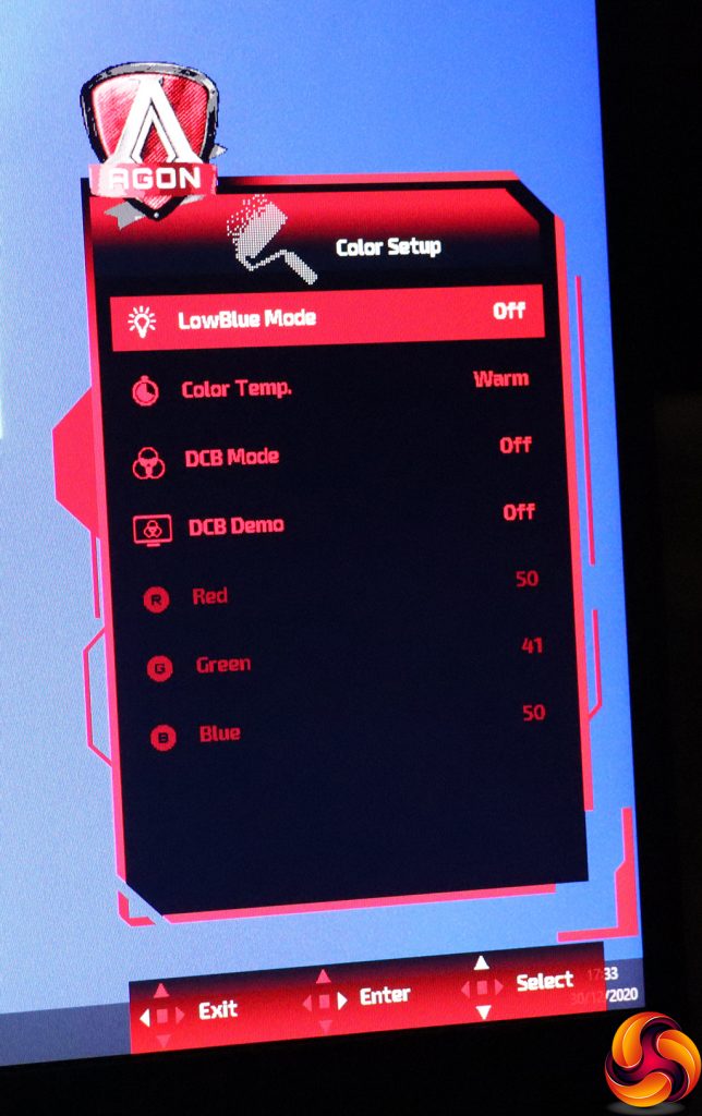 The Color Temp options include Warm, Cool, sRGB and User, which unlocks the individual red, green and blue settings. Finally, the DCB options provide artificial colour enhancements.