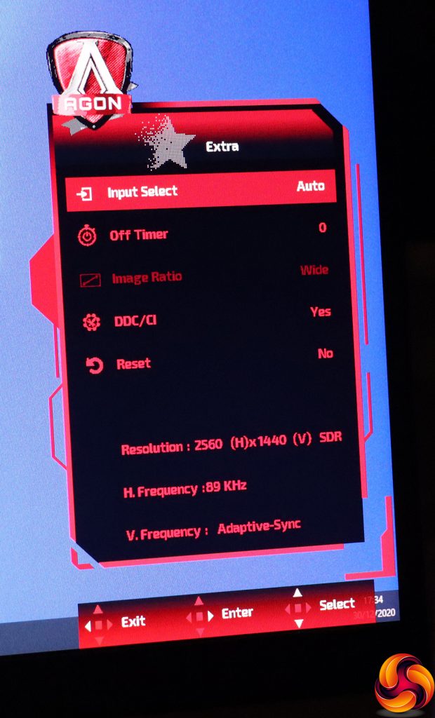 The Extra section provides another route towards selecting inputs or leaving this to auto-detect. You can set up an off timer to prevent leaving the monitor on for days accidentally. You can change the Image Ratio for a non-native resolution input. There's the facility to toggle DDC/CI remote control and reset everything back to default.
