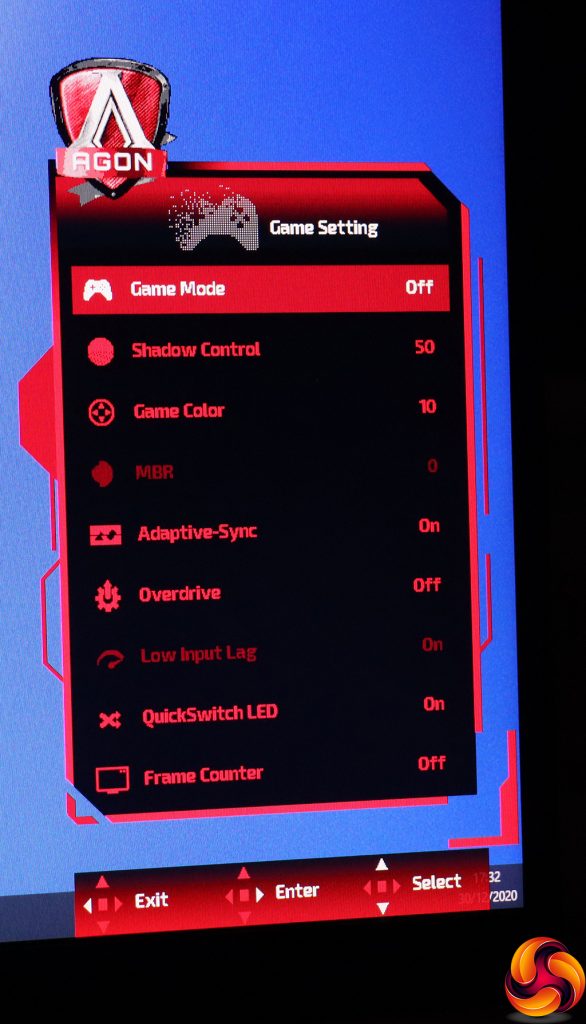 The first Game Setting option within the main menu includes the Game Modes and quite a few more options than other AOC AGON monitors we have tested recently. The Shadow Control function heightens contrast in dark areas. The Game Color option improves saturation and grey level. MBR stands for motion blur reduction, the function of which is self-explanatory.