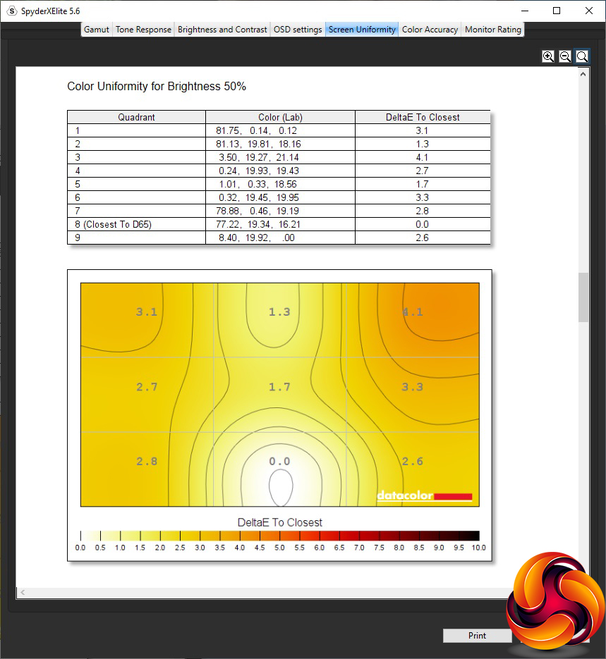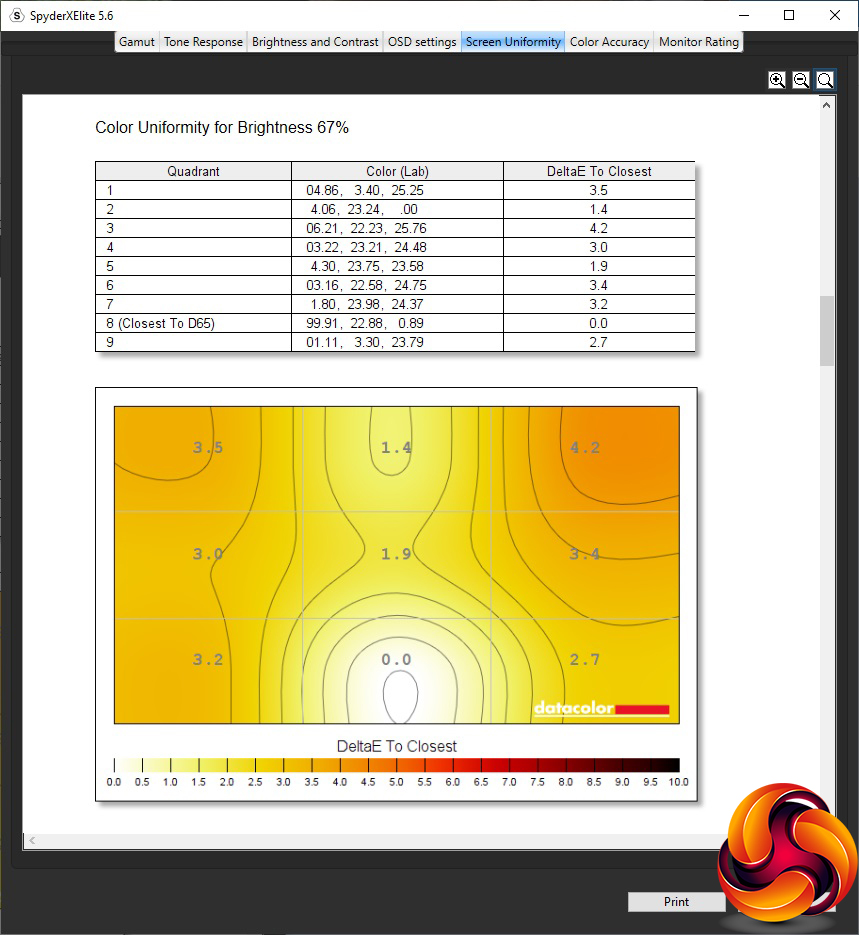 Our main test involves using a DataColor SpyderX Colorimeter to assess a display’s image quality. The device sits on top of the screen while the software generates colour tones and patterns, which it compares against predetermined values to work out how accurate the screen is.