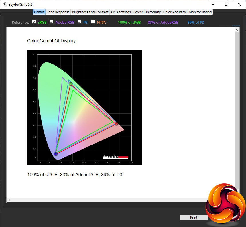 After calibration, the gamut has hardly changed at all, with 100 per cent sRGB, 83 per cent AdobeRGB, and 88 per cent DCI-P3 (a decrease of 1 per cent).