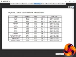 RTS is a little less bright at 390.7cd/m2, but with similar 590:1 contrast and even cooler 8700K white point. Racing mode takes the brightness down a little further to 371.9cd/m2 and the contrast to 560:1, but with an incredibly cool 10000K white point.