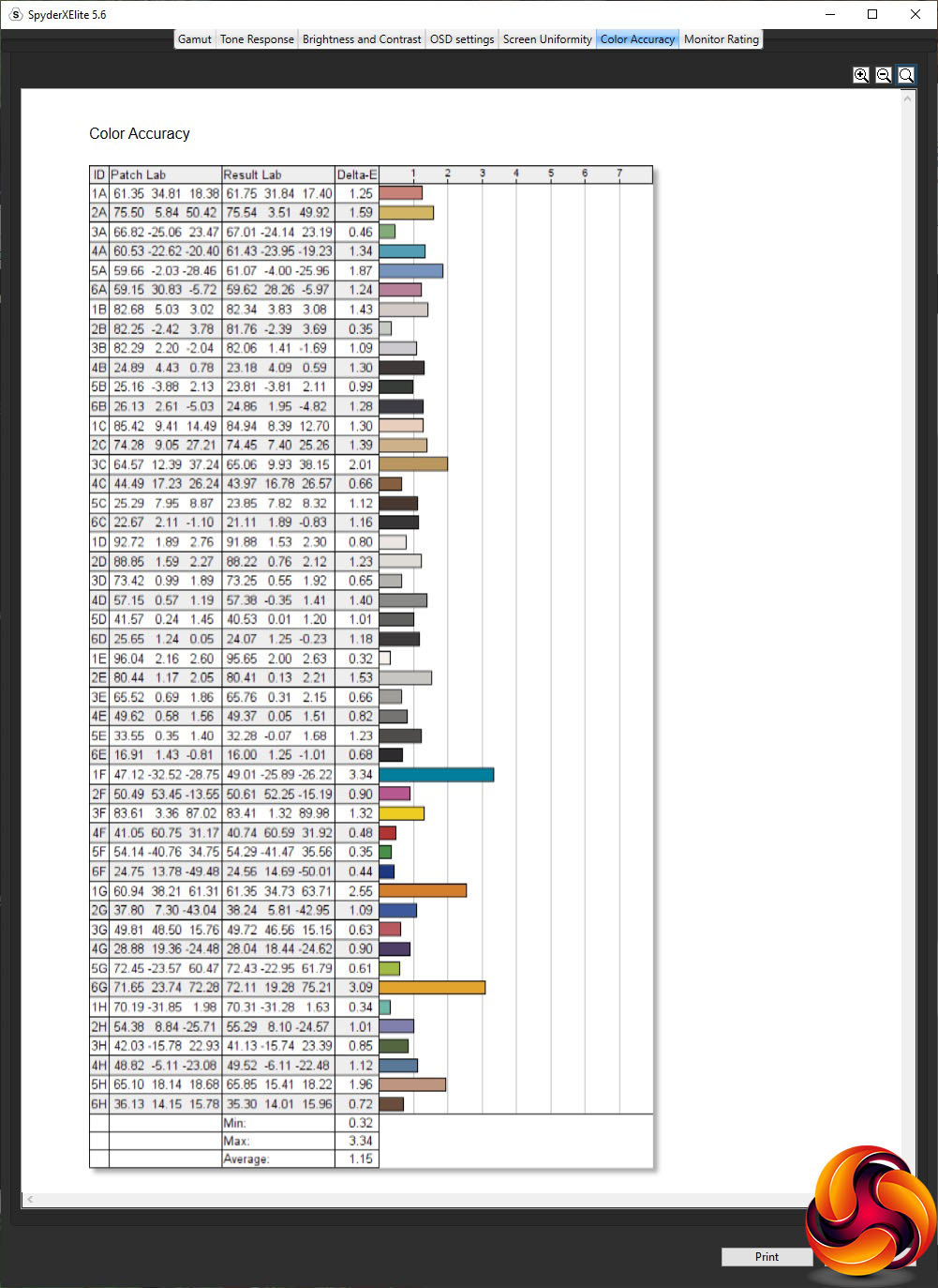 However, the colour accuracy of an average 1.74 deviance is merely good. We expected better, so of course we moved onto calibrating the monitor with the SpyderX.