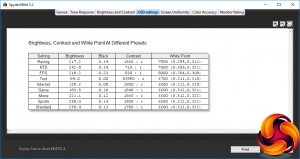 Starting with the Games Modes, the Racing preset has reasonably high brightness and contrast of 217.2cd/m2 and 1,560:1 respectively, but a cool 7900K white point. The RTS Game Mode uses close to full brightness at 242.8cd/m2, but a much lower 710:1 contrast and warmer 7000K white point. The FPS option uses similar brightness to Racing at 218.2cd/m2, and similar cool 8000K white point, but lower 930:1 contrast.