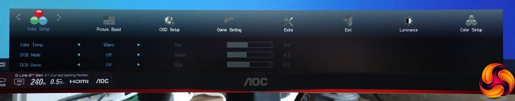 Next along is Color Setup, where you can choose a colour temperature preset from Warm, Normal, Cool or User, with the latter enabling separate configuration of red, green and blue levels. The DCB modes are colour enhancements, and include options like Nature-Skin and Sky-Blue.