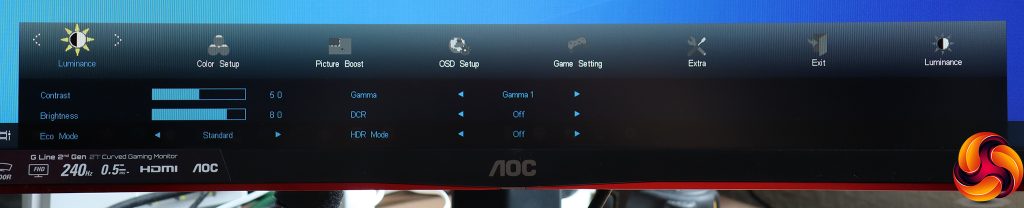 The fourth button from the left calls up the main menu, which appears at the bottom of the screen by default. The first Luminance section includes configuration of contrast, brightness, and Gamma, with the latter offering three options – 1, 2 and 3. You can toggle dynamic contrast (DCR) and HDR support. There are also Eco Modes here, and as before we wonder why these have to be segregated from the Game Modes. The Eco Modes are presets for standard usage scenarios, including the default Standard, plus Text, Internet, Game, Movie, Sports and Reading.