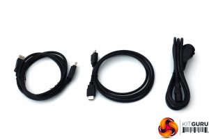 The box contents are a little minimalist, with just a power cable plus HDMI and DisplayPort. A USB upstream cable is conspicuous by its absence.