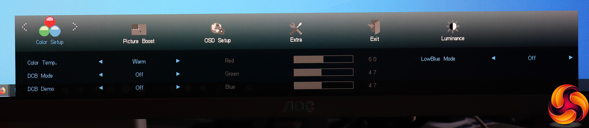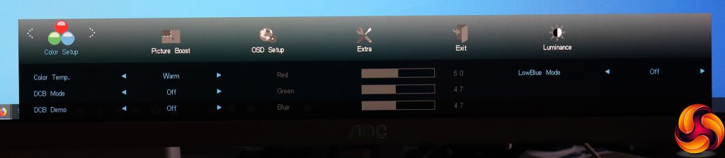 Next along is Color Setup, where you can choose between Warm, Normal, Cool, sRGB and User options. The latter enables the RGB controls to the right, and strangely Warm is the default. We would have expected this to be Normal. The DCB modes are enhancement presets, and include Full Enhance, Nature Skin, Green Field, Sky-blue, and an Auto Detect option.
