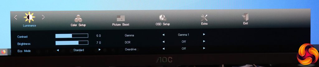 Finally, a short push of the joystick inwards reveals the main menu, with the Luminance section as the default first option. This includes controls for contrast and brightness. The Eco Modes are actually the presets, which include Standard, Text, Internet, Game, Movie, Sports and Uniformity.