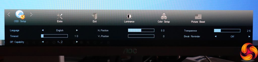 The OSD Setup section lets you configure the appearance of the OSD, including language, how long it stays onscreen, positioning, and transparency. This is also where you choose the DisplayPort support level. You can set a break reminder for the screen as well, which will tell you to go do something else for a bit for a change of scenery.