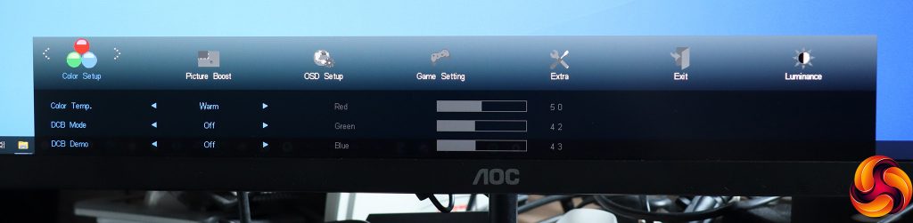 The next main menu option is Colour Setup. Colour Temp options include Warm (the default), Normal, Cool, sRGB, and User, with the latter enabling fine adjustment of Red, Green and Blue individually. The DCB modes are picture enhancements, and include Full, Nature Skin, Green Field, Sky-blue, AutoDetect, and the default Off position. You can also preview these modes with the DCB Demo option.
