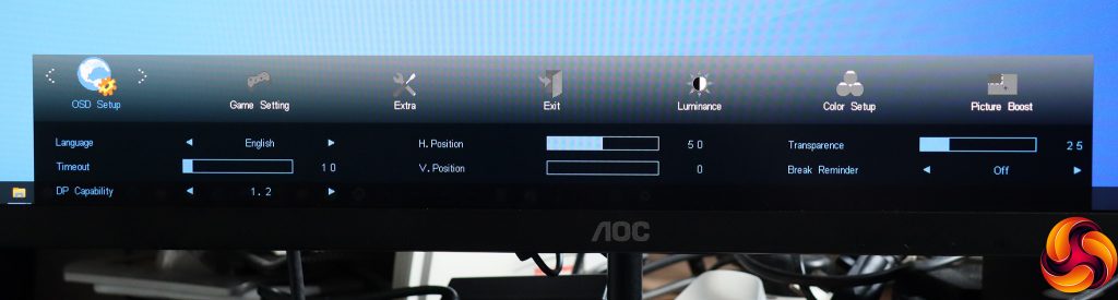 Under OSD Setup you can alter the language of the OSD and other characteristics of how it is displayed. There is also a break reminder to help you remember to get away from your screen occasionally, and strangely this is also where you can downgrade your DisplayPort to 1.1 from 1.2, in case you are experiencing compatibility issues. This is potentially useful, but we don't know why it is in this section of the menu.