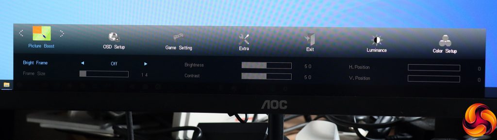 Next along is AOC's weird Picture Boost option, which includes Bright Frame, where you can choose a rectangular section of your screen and give it independent brightness and contrast settings. After many years reviewing AOC monitors, we remain in the dark as to what this is for.
