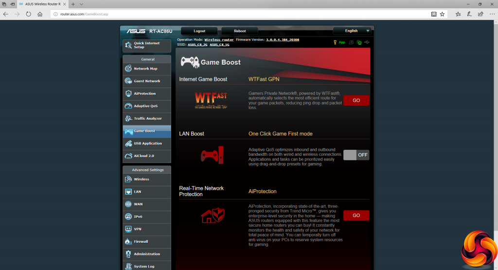 Confusingly, the RT-AC86U does have a Game Boost section, but its contents are different to the GT-AC5300's. The WTFast GPN can be found here, there's another game QoS option, and the AiProtection button takes you to that section on the menu, in case you missed it the first time.