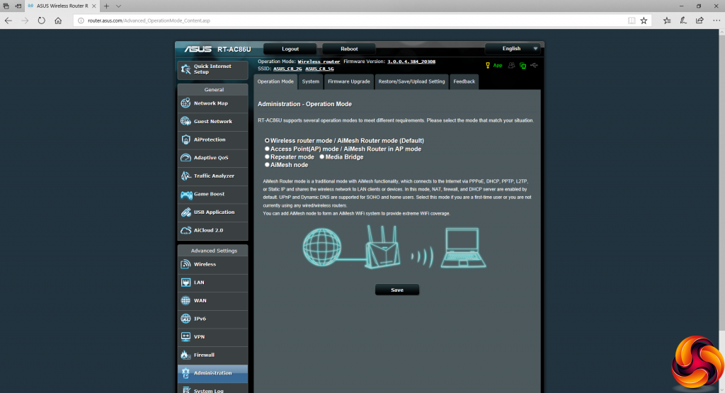 The Administration section contains the same mode options, with access point, repeater and media bridge alongside the default router mode. But the final option is the most important one for this article – AiMesh – which we will be looking at in more depth in the next section.