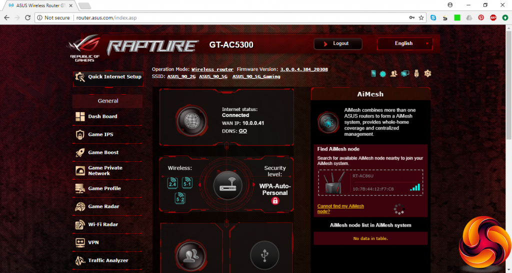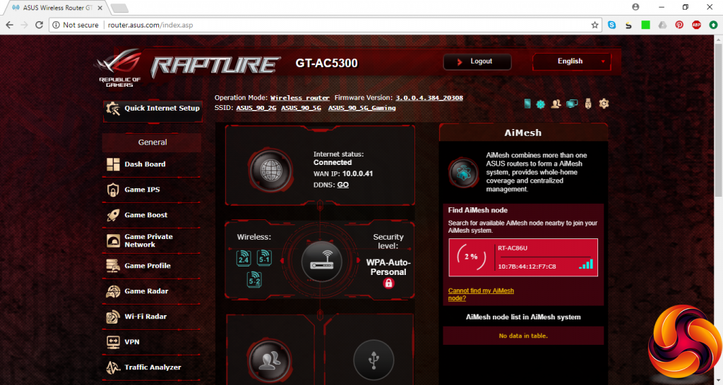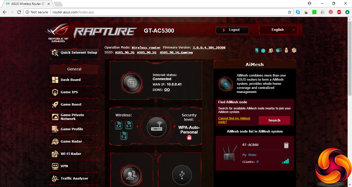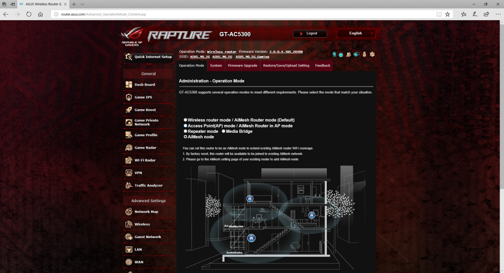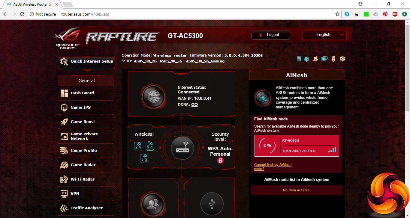 We intended to use the GT-AC5300 as the main router, since it has tri-band WiFi. Although the GT-AC5300 also has the ability to be turned into a node, in Router or AP mode it's automatically available as an AiMesh base station, with no further configuration necessary at this stage. So the next step is to fire up the secondary router, in this case the RT-AC86U.
