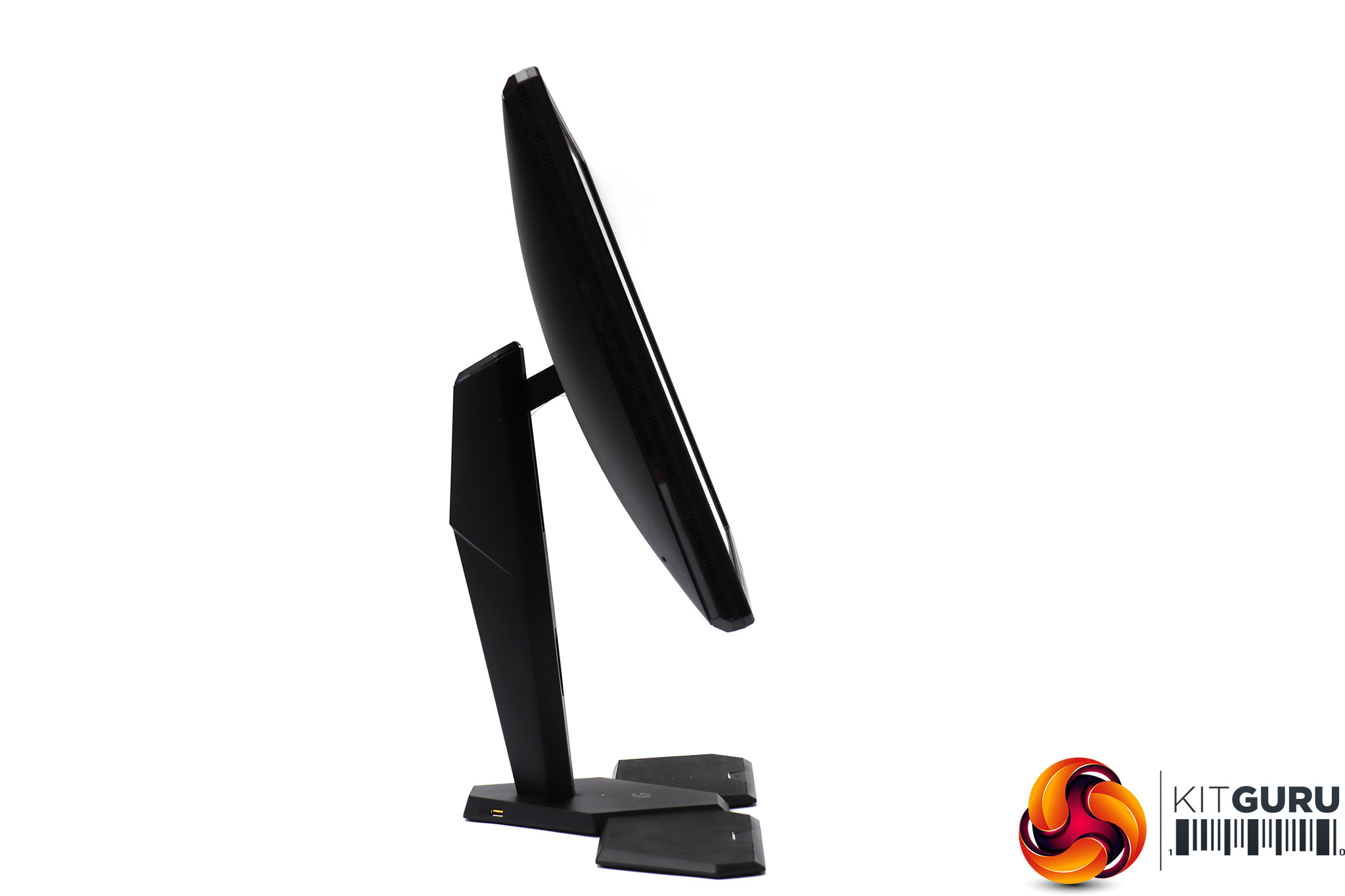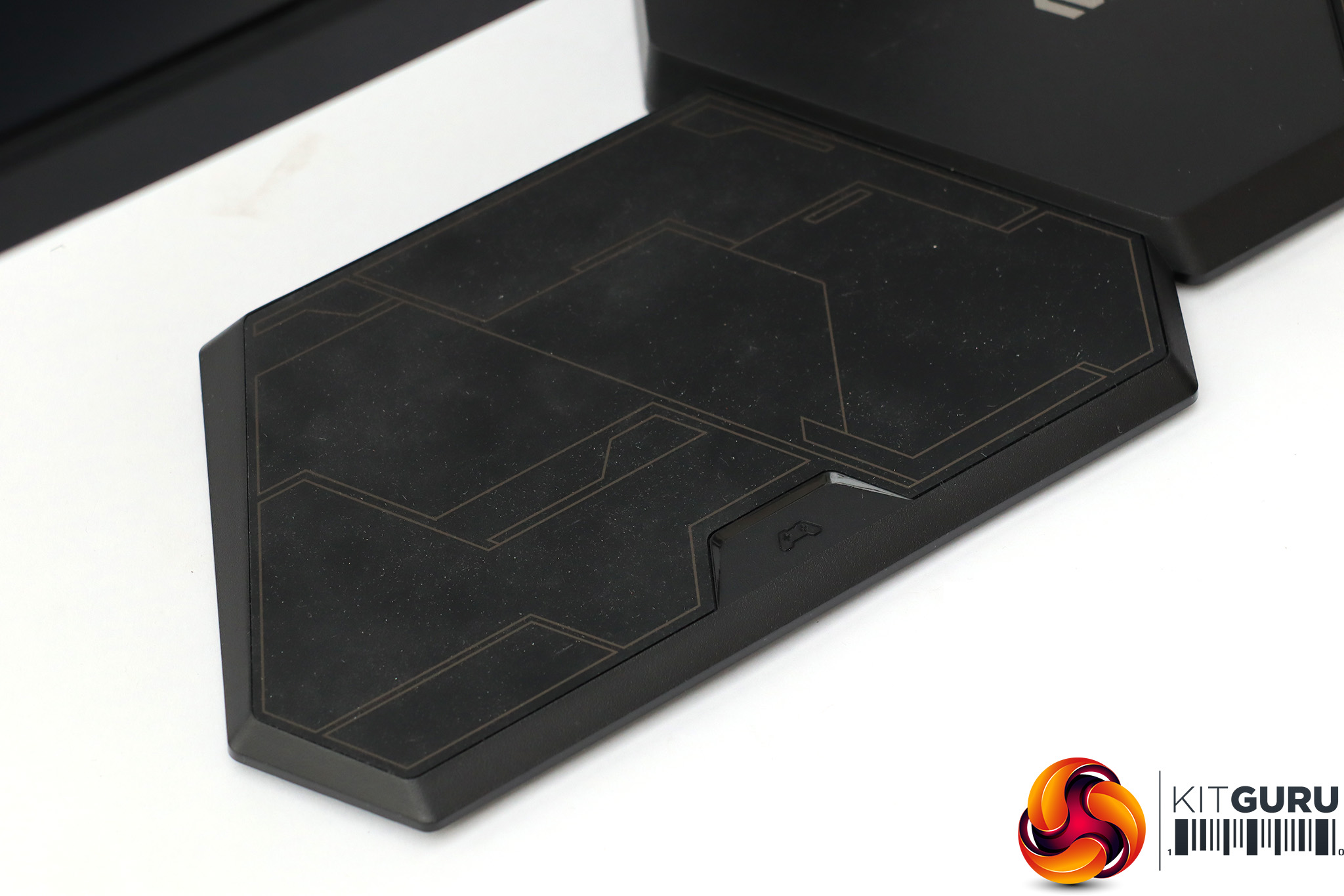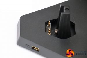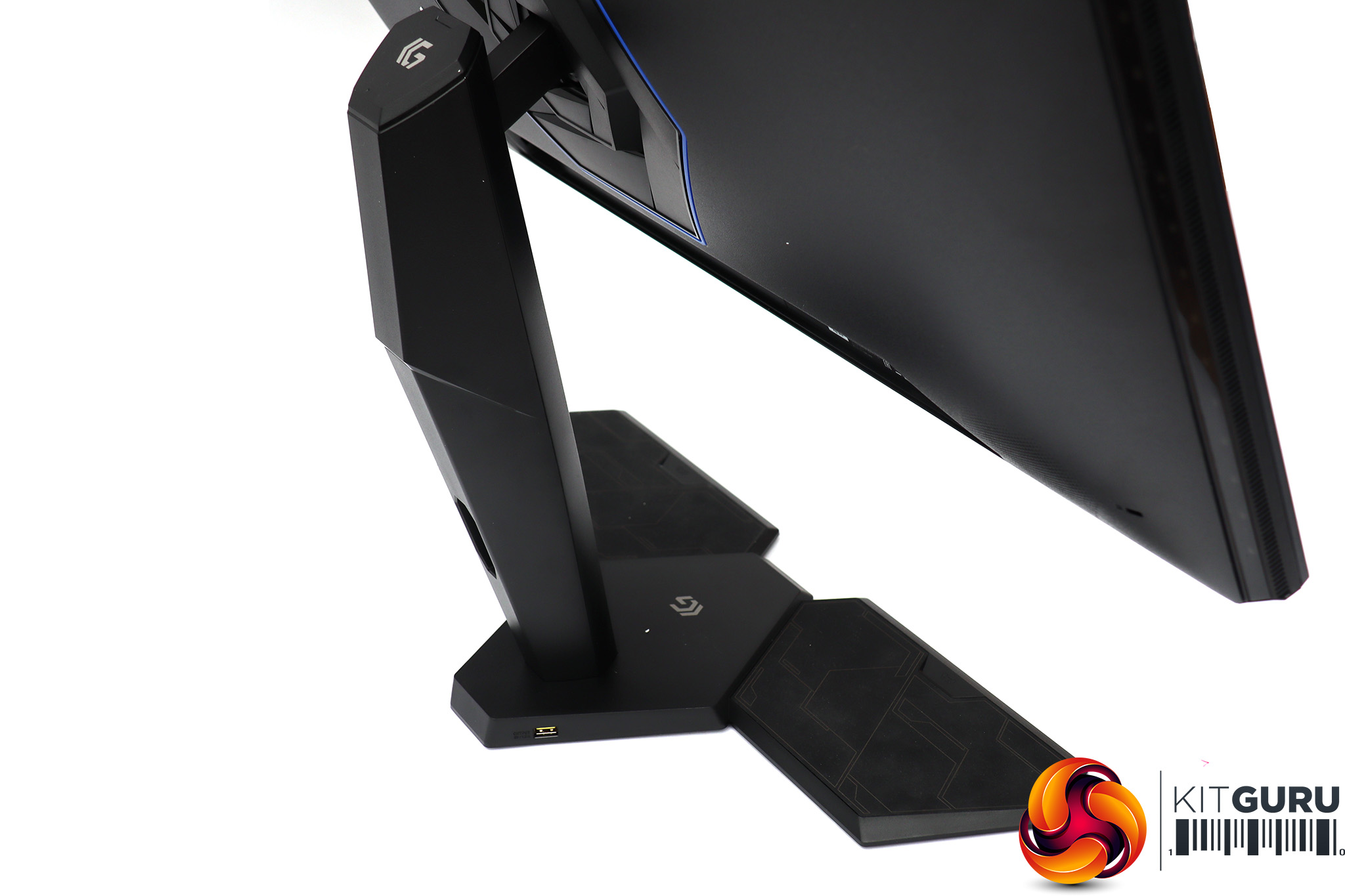 However, the base has a bit more going on than your average monitor stand. The angular surfaces on either side are strangely reminiscent in shape to a console control pad, and if you look closer you will see a symbol of this very item. They're there for you to place your controllers when not in use. Even better, USB charge-only ports are located on either side at the rear. You attach your controllers' cables to these and can conveniently charge them.