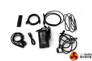 There are quite a few bits and bobs inside. Apart from the requisite power brick and cords for EU and UK sockets, plus both DisplayPort and HDMI cables, there's a USB upstream for hooking up the hub. More unusual is the USB Type A to Micro-USB, the function of which we will discuss shortly. There's also a remote control for operating the OSD from the comfort of your sofa – a welcome convenience for the lean-back experience of console gaming.