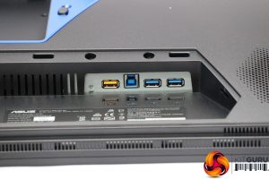 The ports are hidden behind a plastic panel that pops out. On one end is the power input, followed by the three HDMI 2.0 inputs, DisplayPort, and the audio minijack output. On the other side of the stand is the USB hub. There's a Type B upstream input and two USB 3.0 outputs. The yellow USB output is for powering the stand if it's being used separately from the monitor. Otherwise, power contacts in the stand itself relay power to the USB ports in the base.