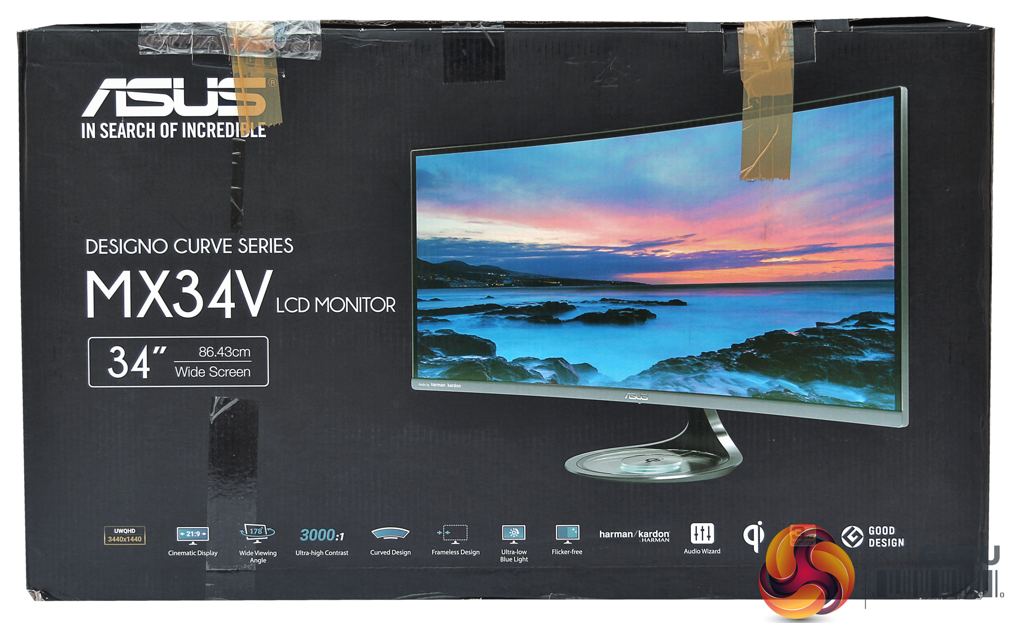 The ASUS MX34VQ‘s 34in diagonal and 21:9 aspect makes for a sizeable box, although ours had obviously seen other reviewers and was a bit tatty when we received it.