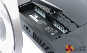 There's an easily removed plastic cover over the power connection, headphone jack, and video ports. The latter include three HDMI 2.0 connections plus a single DisplayPort 1.2, so you can connect up to four inputs to this screen.
