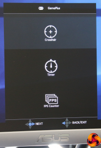 Strangely, the GamePlus modes are buried in the System Setup menu. These provide the ability to enable onscreen crosshairs, a timer, and a hardware FPS counter.