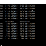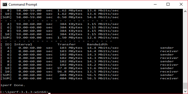 Note that the client command sends four streams of data simultaneously, simulating a multi-client connection as closely as possible with just one client. It takes 60 throughput readings at one second intervals and then averages the result.