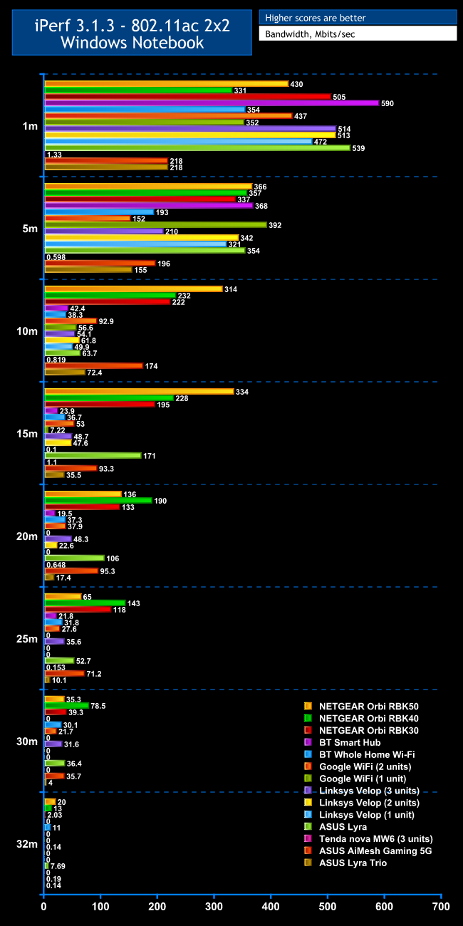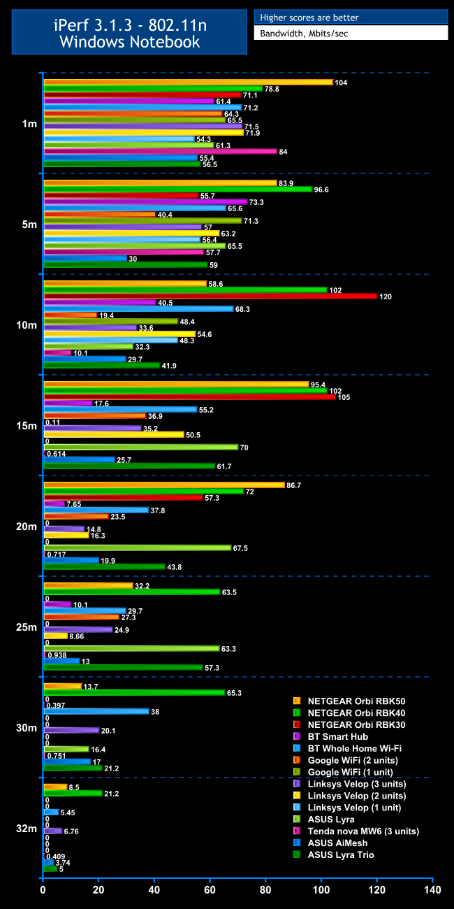 Amazingly, the Lyra Trio keeps its third position at 30m, and even manages 5Mbits/sec at 32m, which is actually behind a shed so most systems fail to reach this distance. Even ASUS's original Lyra failed this last distance.