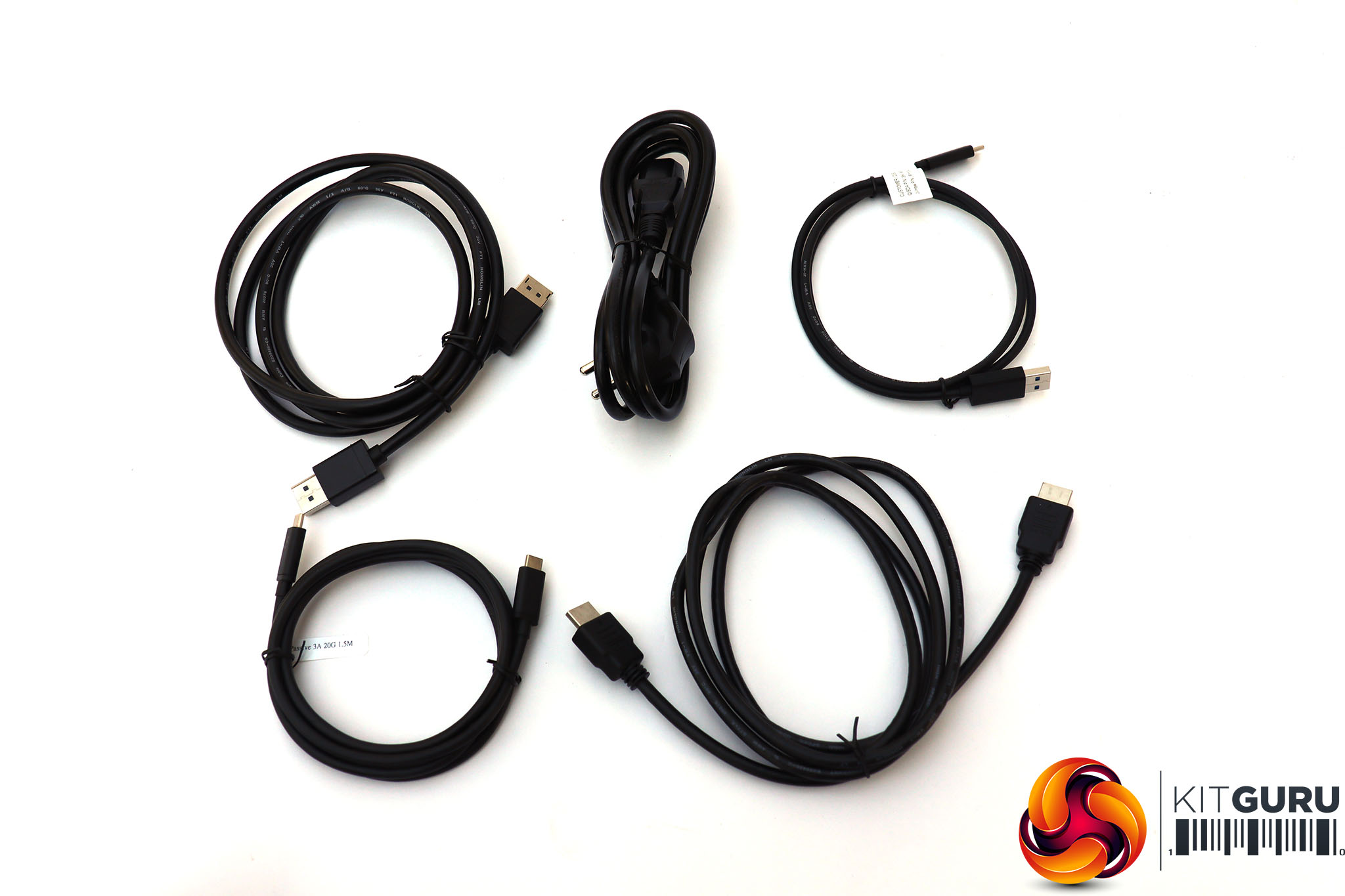 Inside is a generous range of cables. On top of the power cord are ones for DisplayPort and HDMI, plus a Thunderbolt 3 cable and USB-C to USB Type A wiring.