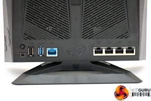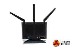 On the rear, next to the power socket for the external supply, are two USB ports. The one furthest left is USB 2.0, then the next one along supports USB 3.0. Then there's the Gigabit Ethernet WAN port. The other side of the ROG logo houses the four-port Gigabit Ethernet LAN switch. We're not sure quite why only one USB port supports 3.0, but you probably won't find it a big restriction, and the port allocation is otherwise pretty standard for a broadband router in this class and price range.