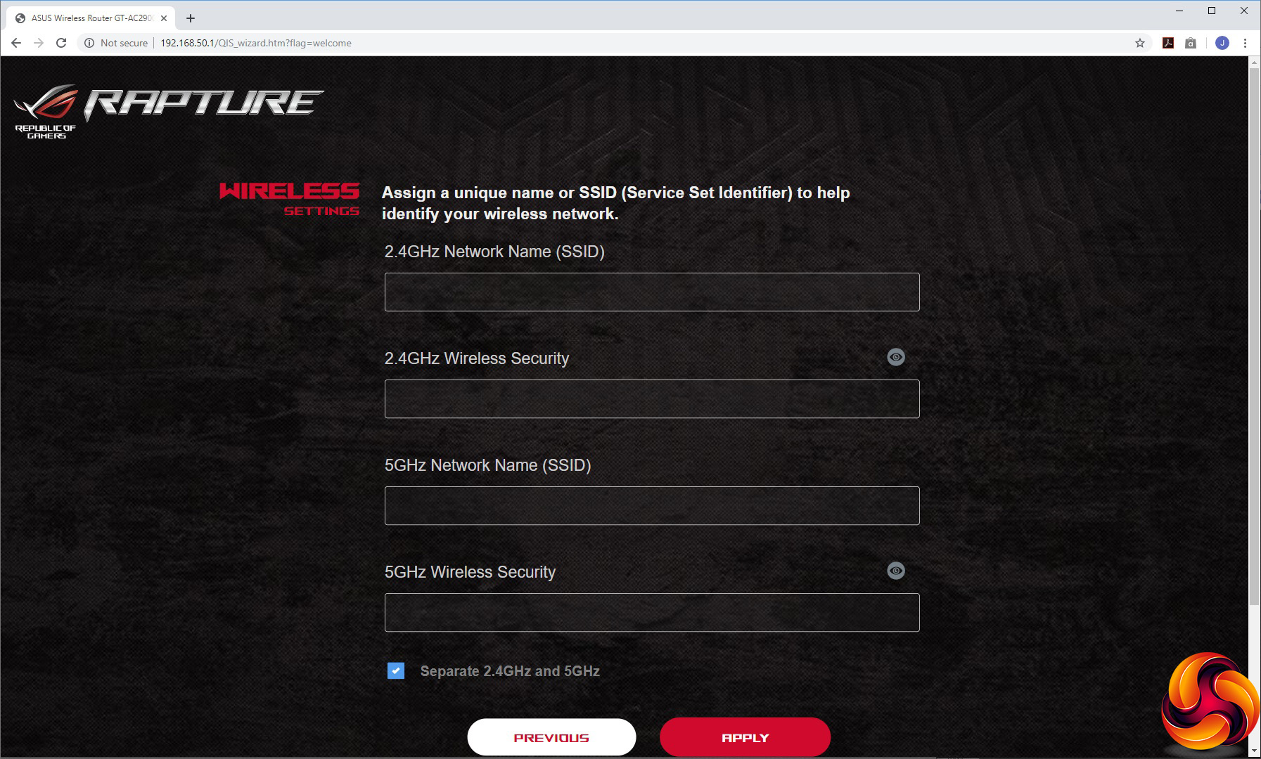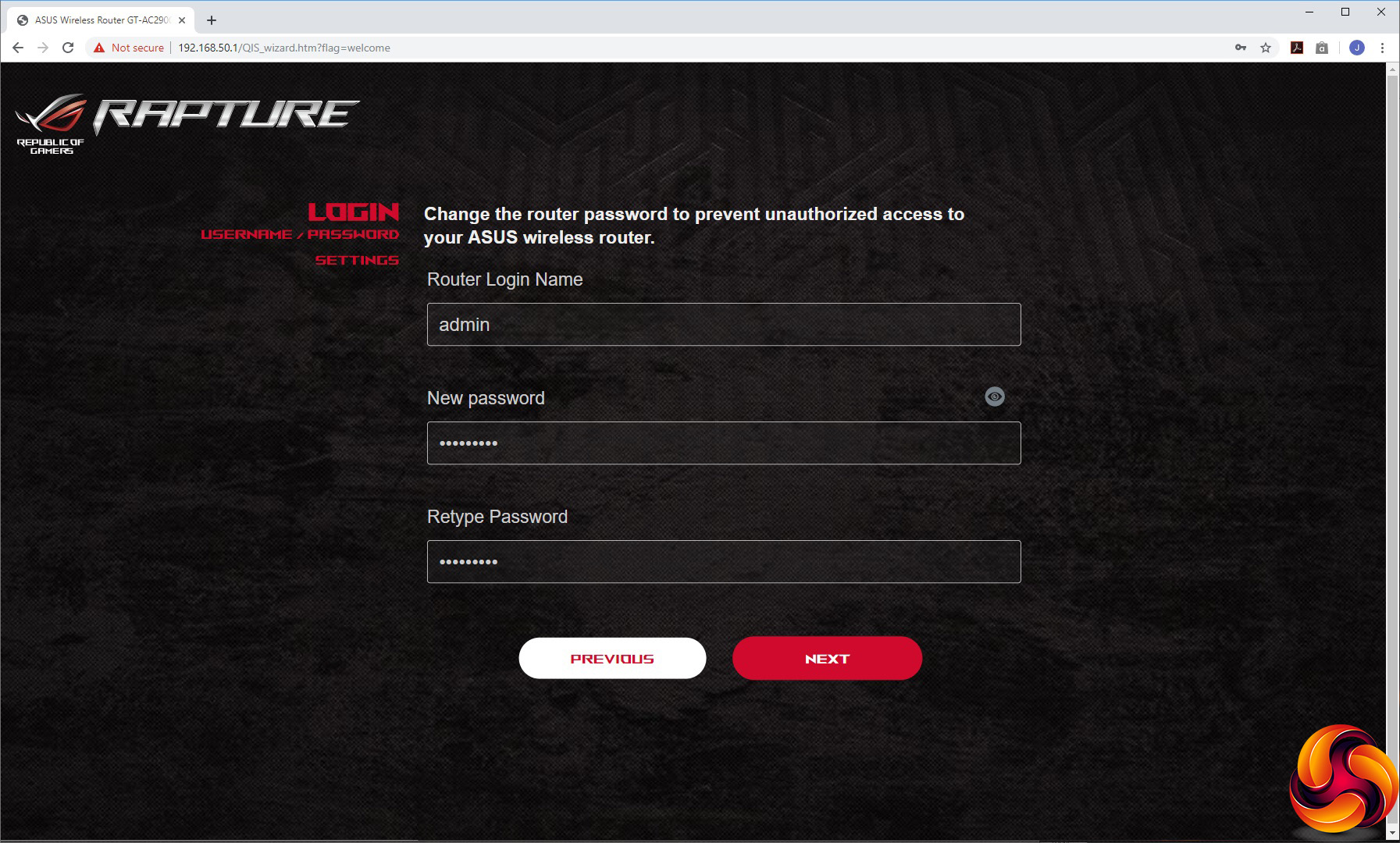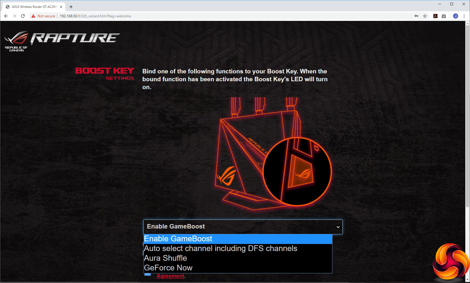 Heading to the router's IP address for the first time with a Web browser invites you to go through the setup wizard. Aside from setting up the SSIDs and passwords for the 2.4GHz and 5GHz WiFi radios (or keeping them the same), you're invited to set the function of the Boost key on the side of the device. Then you set the admin username and password, before being prompted to upgrade to the latest firmware (assuming you have a working Internet connection). Finally, it's time to login to the administration backend.