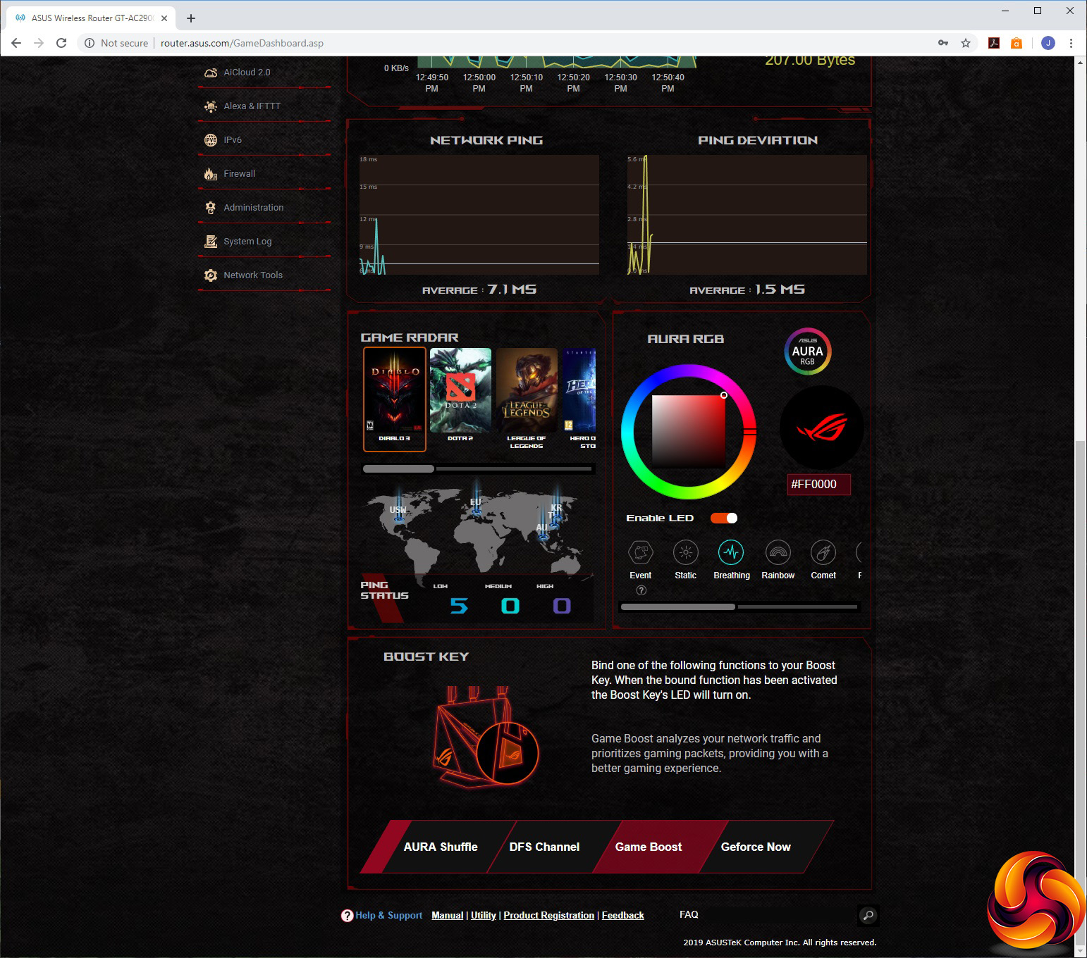 Nevertheless, the range of features is equal or possibly even greater than the NETGEAR Nighthawk Pro Gaming XR700 or XR500. The initial admin screen displays status information, and if you scroll down you can use the Game Radar function to look at ping status for various global game servers, adjust the configuration of the router's Aura RGB lighting, and change the function of the Boost button.