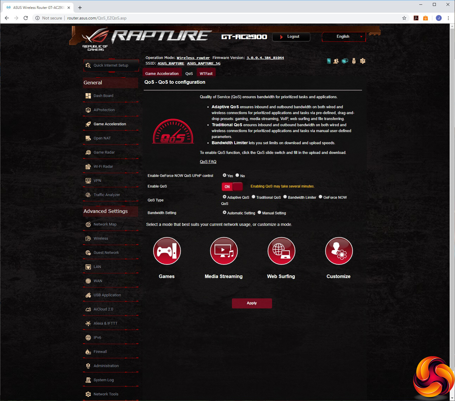 One of the options for this button is GeForce Now, NVIDIA's technology for streaming games from your accounts on Steam, Uplay and others to any device, even one with quite puny hardware. However, for PC users the service is still in beta and there's a lengthy waiting list to get on the trial. The GT-AC2900 doesn't act as a GeForce Now client, but it will prioritise the remote traffic so it will run more smoothly on your home network.