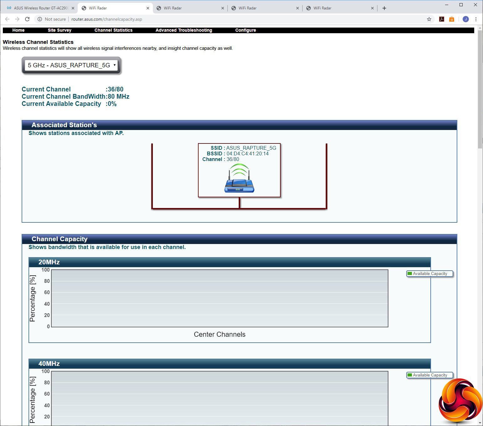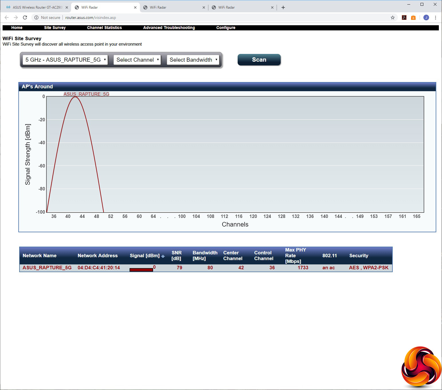 The WiFi Radar may have a similar name, but its function is completely different. Clicking on any of the four options opens a completely different interface where you can scan the spectrum for other routers, although at first we thought this didn't seem to pick anything up in our test environment, when in fact there were loads of other routers in the vicinity.