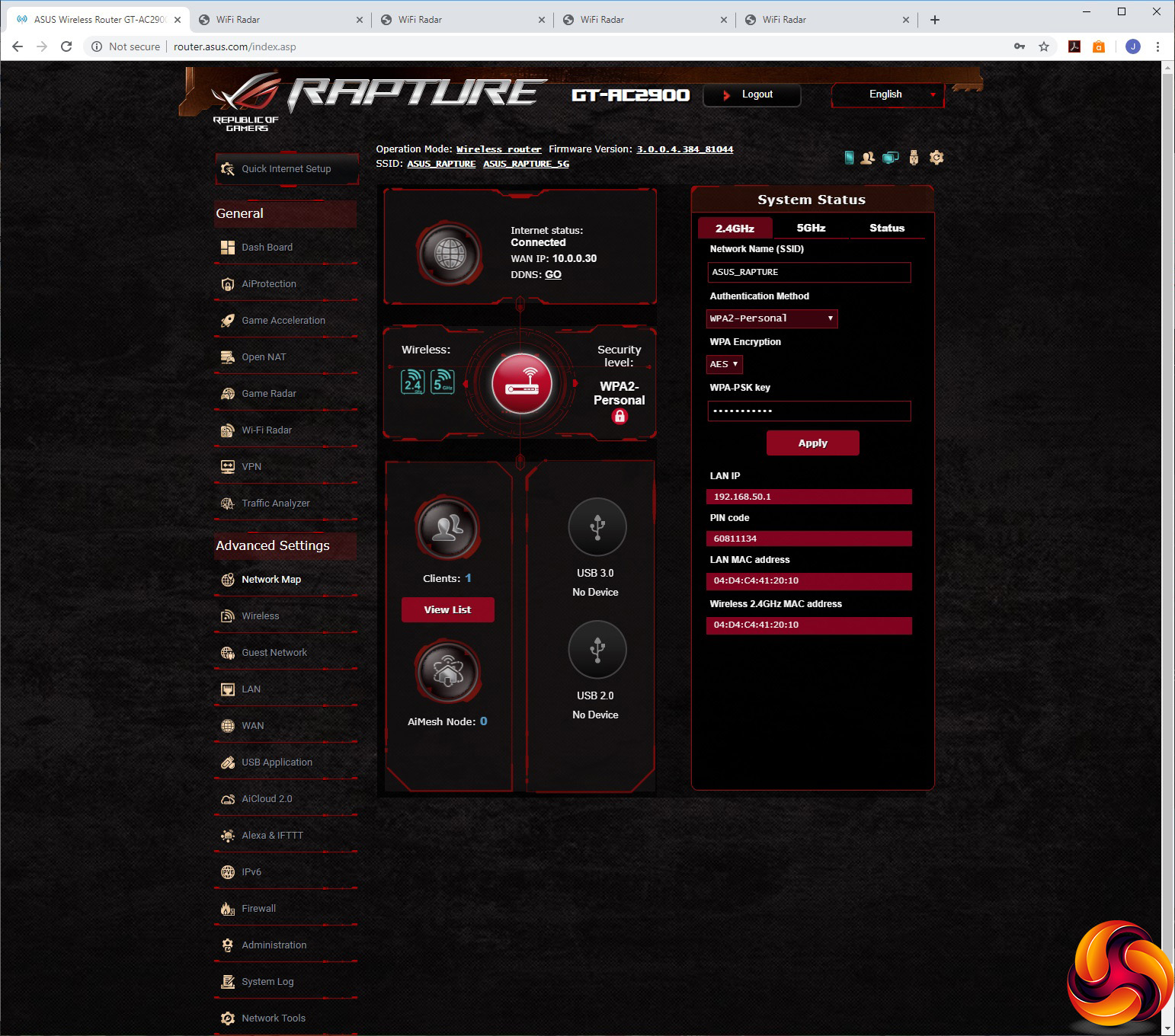 The Advanced Settings section is like a whole new interface, and starts off with its own overview in the Network Map section. You can also alter SSIDs and passwords here.
