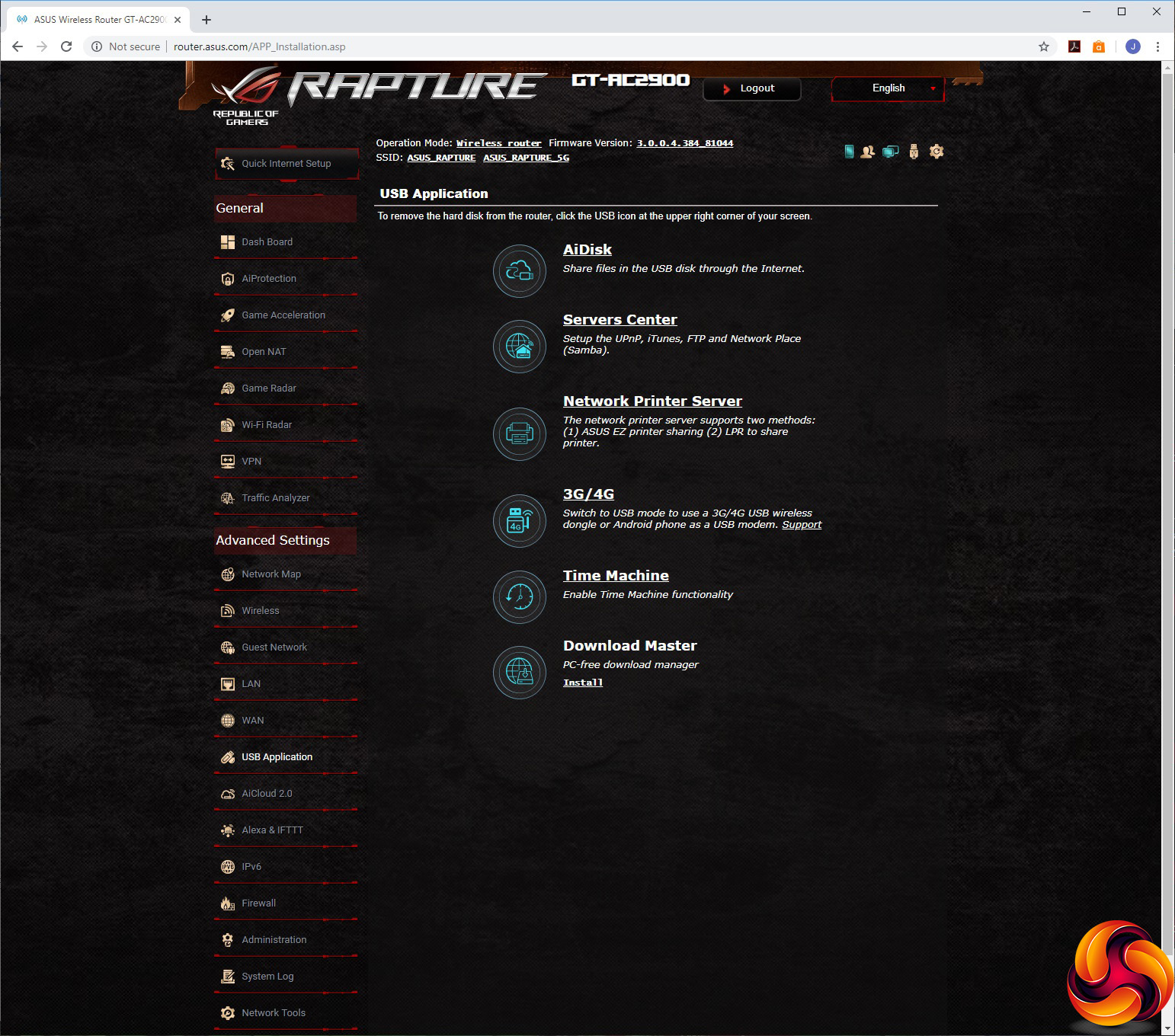 The USB Application section gives you lots of options for how the USB ports are used, from AiDisk network storage, UPnP media servers and FTP, networking printing, 3G or 4G USB mobile data dongle, Apple Time Machine backup and a download interface for leaving the router to manage your P2P downloads directly, without a PC.