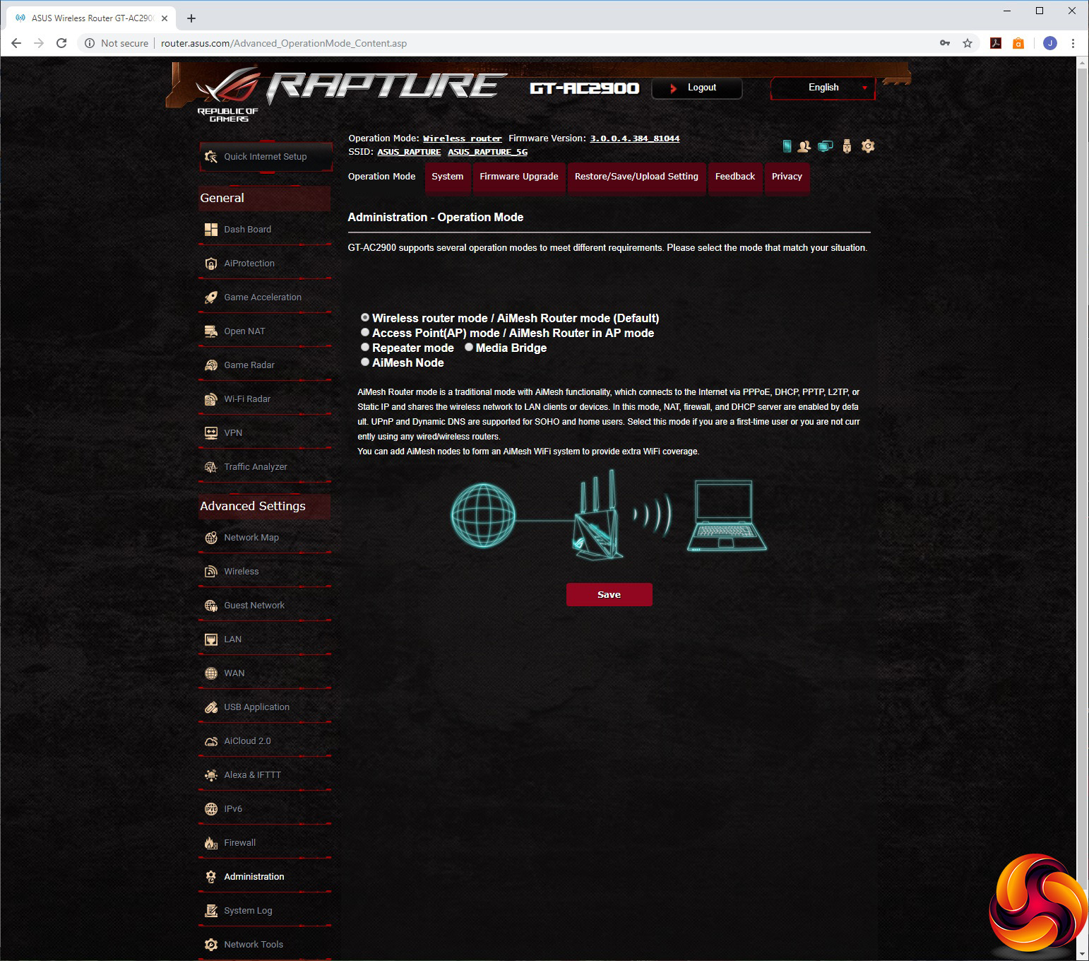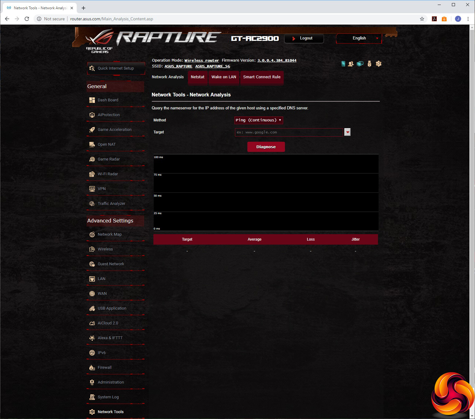 Finally, the Administration section lets you choose between router, AP, repeater, media bridge and AiMesh node modes. You can configure various system settings, upgrade the firmware and restore, save or upload the router settings. The logging system includes General, Wireless, DHCP, IPv6, routing table, port forwarding and connections sections. Network tools include ping, traceroute, netstat, Wake on LAN options, and the ability to set up Smart Connect Rules. The latter is likely to scare most users into quickly selecting another section.