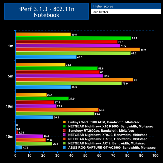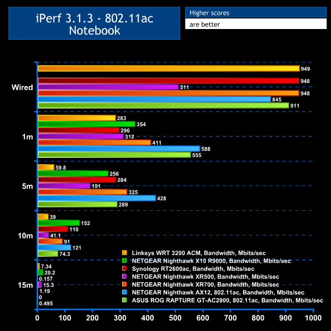 At a close 1m range, the GT-AC2900's 802.11ac speed of 555 Mbits/sec is excellent, second only to the NETGEAR Nighthawk AX12.