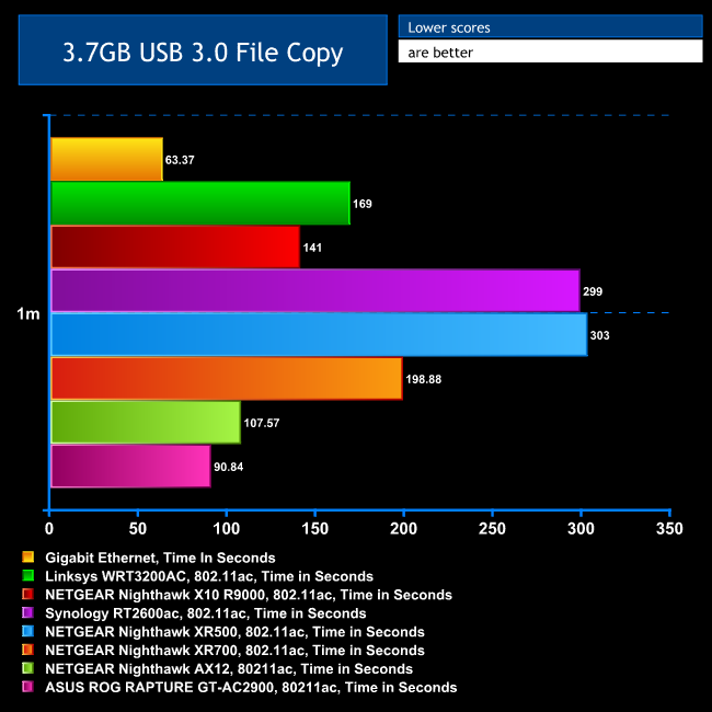 This was actually the GT-AC2900's best result, beating everything else hands down, showing that the router's USB port is fast and its Windows sharing provides optimum throughput.