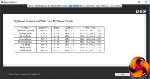 Scenery Mode pushes the brightness to the maximum with 518.8cd/m2, with the highest contrast of 1,470:1. Racing mode is similar to the default, but with a slightly lower 1,380:1 contrast. Cinema Mode, however, uses a lower 352.7cd/m2 brightness, lower 1,090:1 contrast, and much cooler 9500K white point. RTS/RPG is virtually the same as Racing mode, apart from having a higher 1,470:1 contrast, and FPS mode is the same apart from a slightly lower 1,370:1 contrast, which could easily be a variation in measurement. Likewise, MOBA Mode is scarcely different to Racing or FPS Modes.