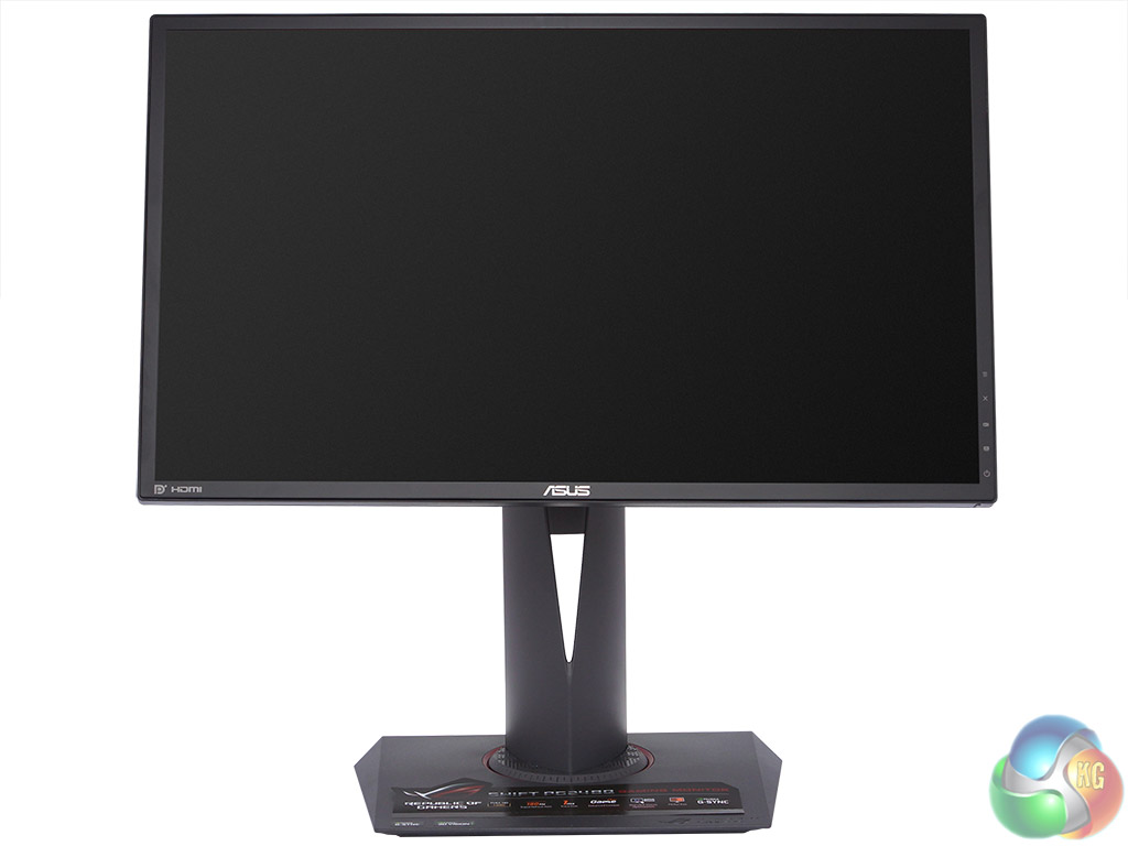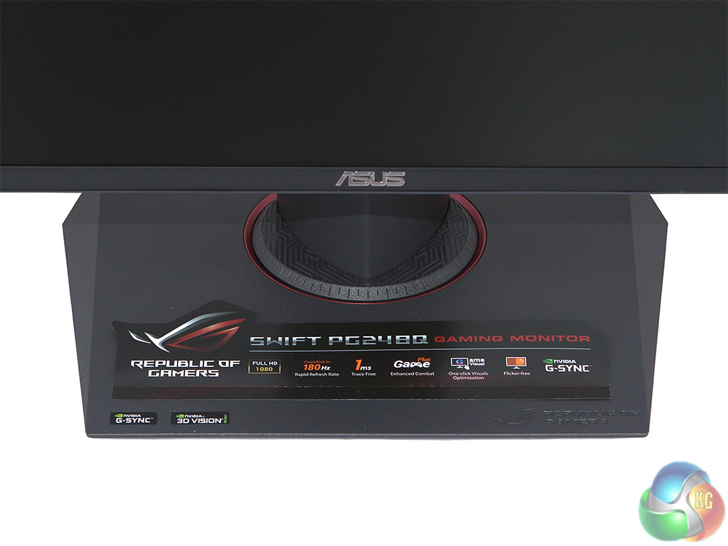 The monitor's base proudly boasts about its main features, including the 180Hz overclocked refresh, 1ms response rate, game modes, and NVIDIA G-Sync support. Fortunately, this is a removable sticker, so you can enjoy the monitor's graphite blackness. There's a flashing LED ring around the rotating base, too, for added bling.