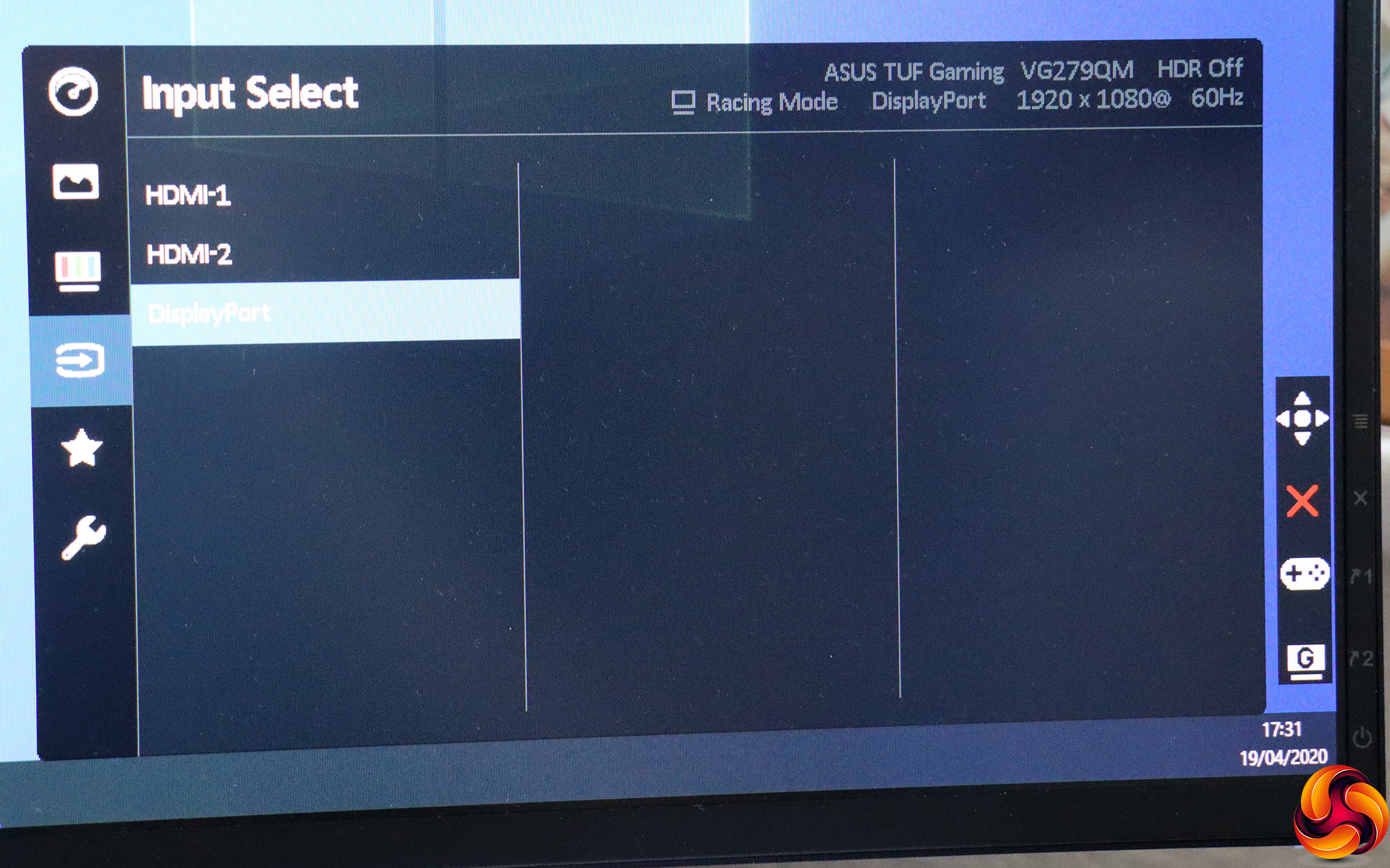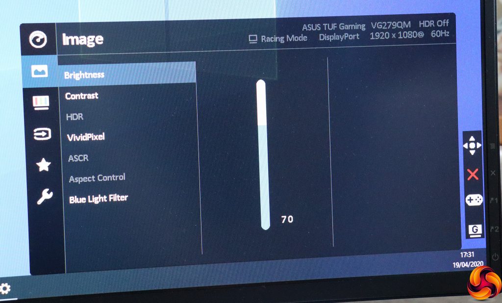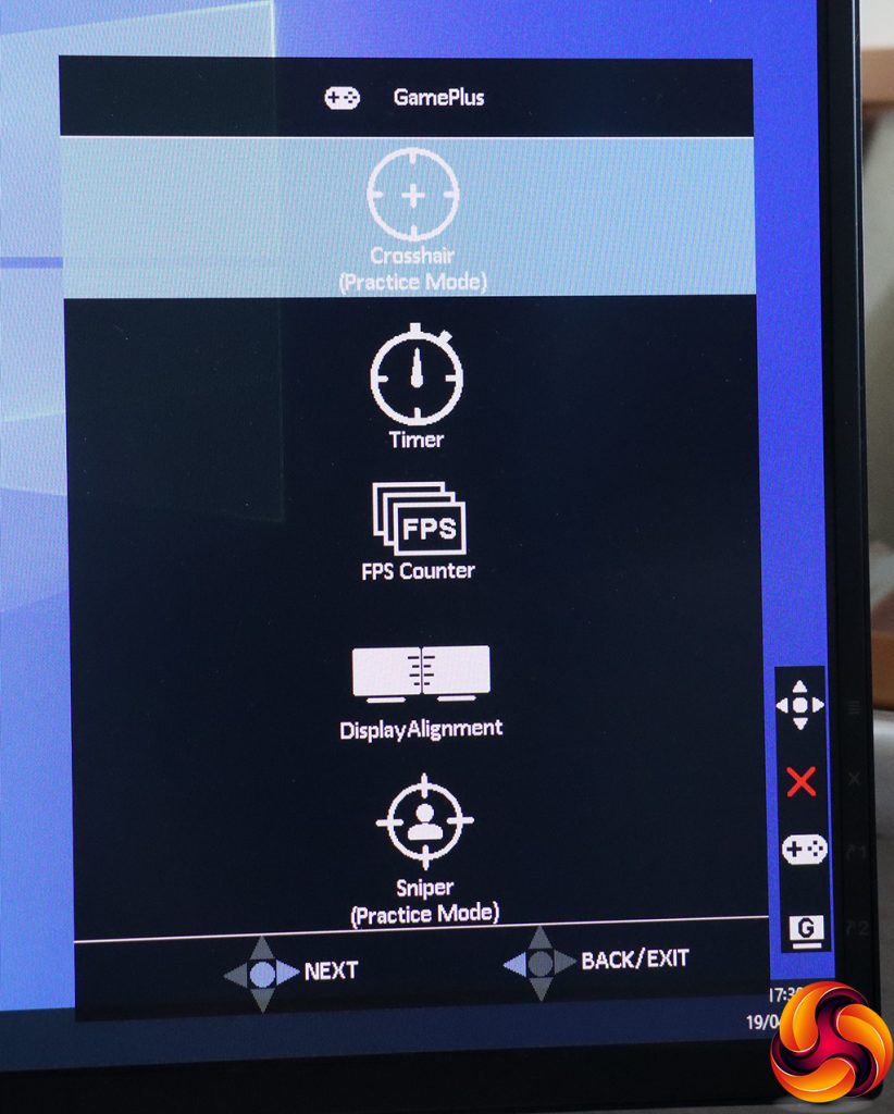 The next button up (again, user-configurable) provides access to the GamePlus options. These include the ability to put a hardware crosshair onscreen – for practice only, obviously. You can set a timer so you don't play too long (that never happens, obviously) and an onscreen hardware FPS counter. There's also the option to add rulers onscreen so you can align a multi-monitor setup, assuming you have two VG279QM screens. There's even a Sniper mode that magnifies a section around the crosshair. Again, for practicing only, obviously.
