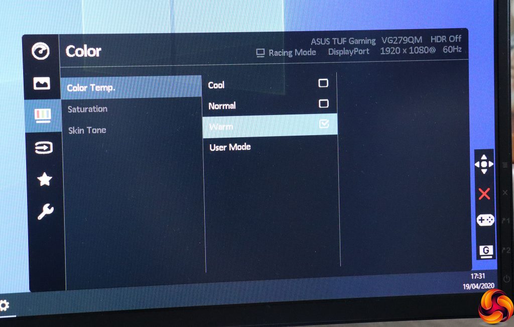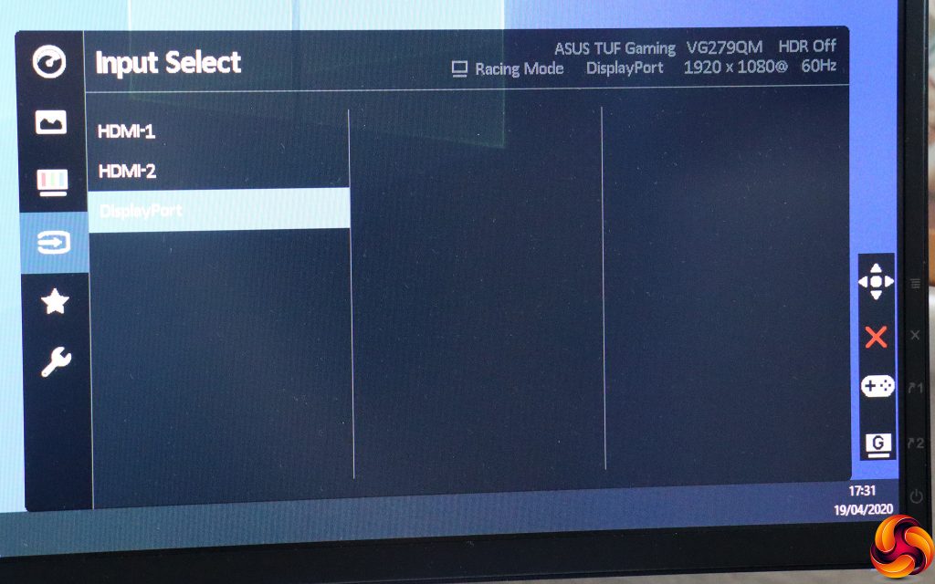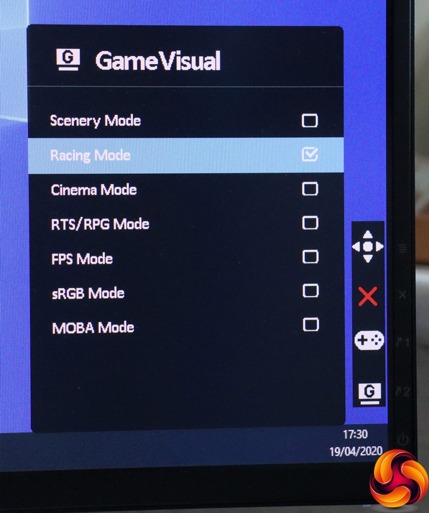 The next button up lets you select the GameVisual presets, which include Scenery, Racing, Cinema, RTS/RPG, FPS, sRGB, and MOBA, with Racing the default. You can change the function of this button, of which more later. To get to this interface, you press the button once to see the little menu on the right, then again to get the menu you actually want.