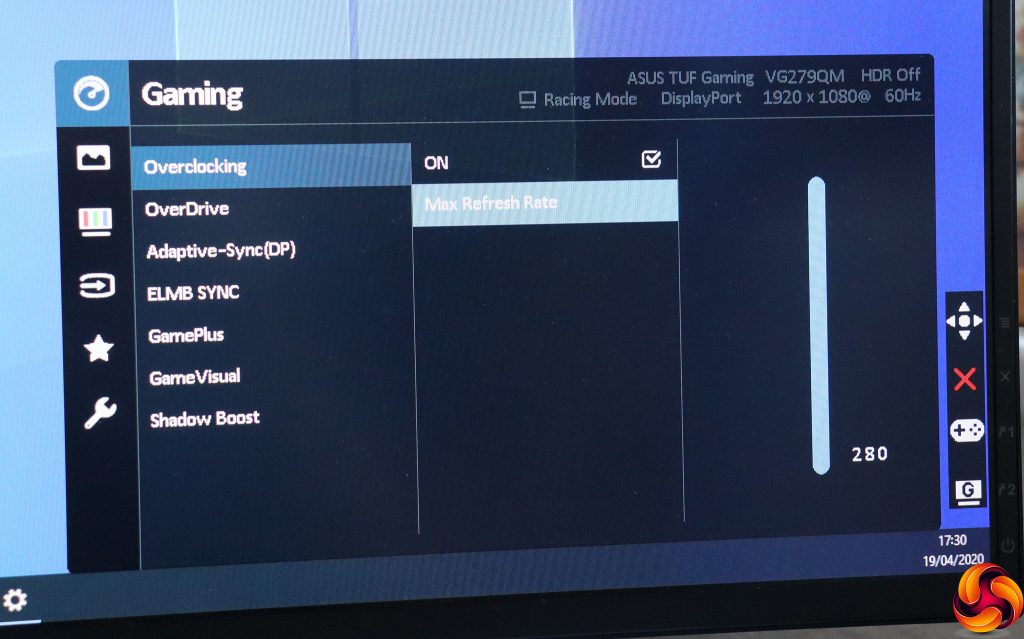 Finally, pushing the joystick in calls up the main menu, with the first option being Gaming. Here you can set the refresh overclocking. The default maximum is 240Hz, so you need to enable this feature and increase the value to get to the much-vaunted 280Hz. You can also enable OverDrive to further improve pixel response, and toggle Adaptive-Sync, which is on by default. ELMB Sync is “Extreme Low Motion Blur Sync”, which reduces motion blur whilst also allowing adaptive sync to be enabled. Many other monitors don't allow this. You can access the GamePlus modes and GameVisual options here as well, and finally Shadow Boost improves detail in dark areas.