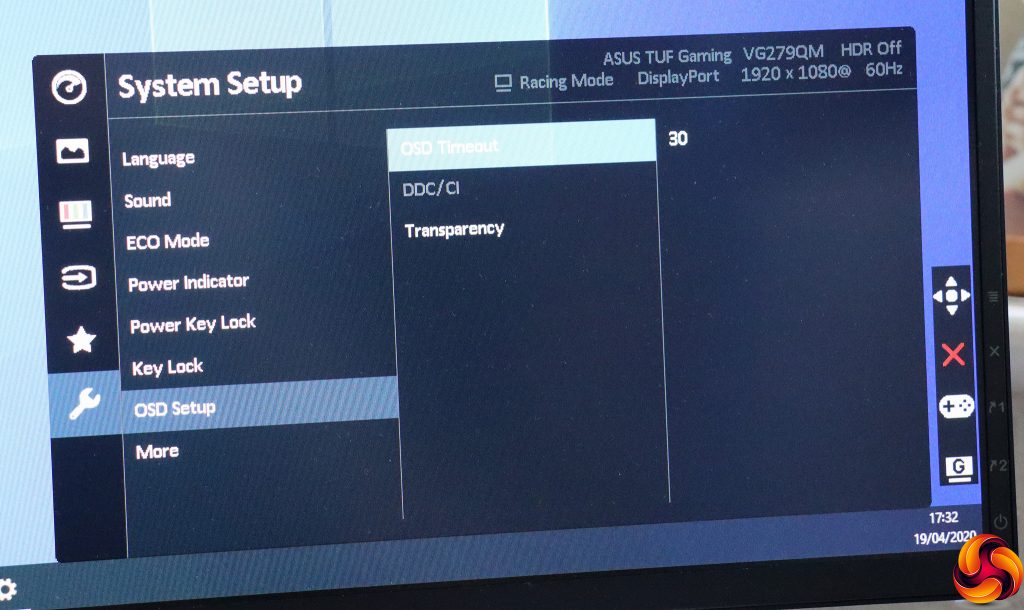 Finally, under System Setup you can change the OSD language, control speaker volume under Sound, engage an ECO Mode to save power, configure whether the power LED is on and whether the power key and other keys are operational. You can also change how the OSD is displayed. If you scroll further down, you can reset all the settings to default.