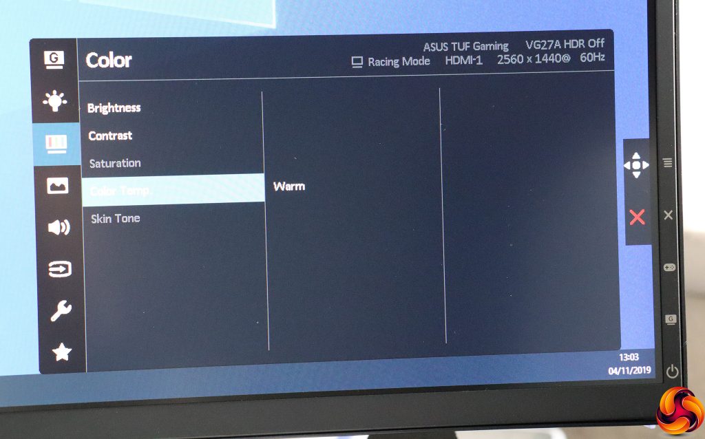 The Color submenu includes Brightness, Contrast, and Color Temperature, with Warm, Normal, Cool and User options for the latter. With User mode, the red, green and blue levels can be adjusted separately. The Saturation and Skin Tone options are greyed out in the default Racing GameVisual mode.