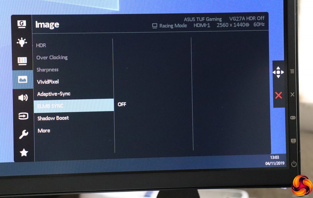 The Image options include turning on HDR, which includes ASUS Gaming and ASUS Cinema modes. Over Clocking is only available if you are using a DisplayPort connection, which is required to support 165Hz refresh. Sharpness will also only be available under certain circumstances too. VividPixel is also a sharpness system, but works on outlines. You can toggle Adaptive Sync here (it's on by default), and ASUS' ELMB Sync (off by default). This is a system for reducing screen tearing, ghosting and motion blur.