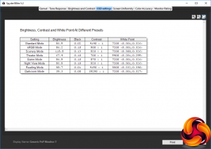 Many of the surprising number of OSD presets don't feel that different to the naked eye, partly because four of them hover around the 86 or 87cd/m2 britghness with a 7200K white point. The Standard and and sRGB modes differ only in contrast, and Scenery mode isn't much of a variation either, with a 115.8cd/m2 brightness.