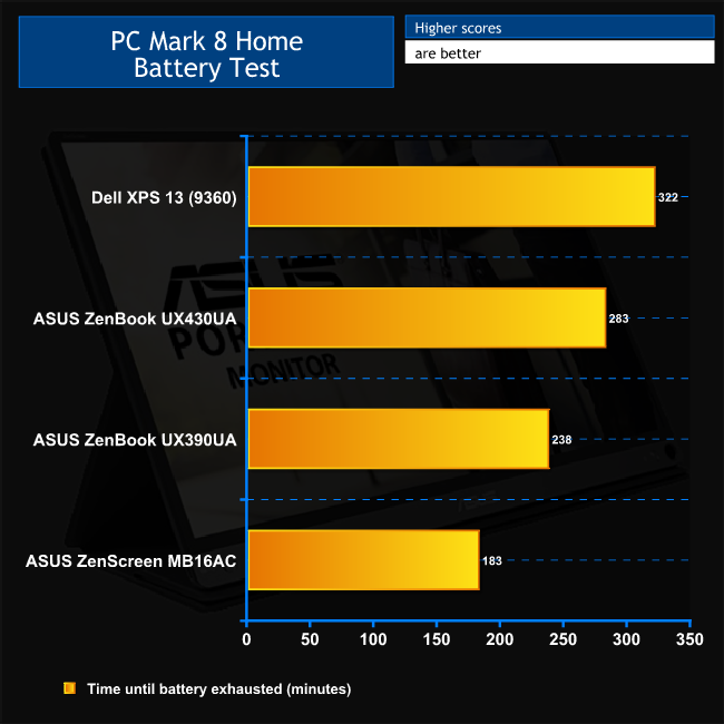 A very important consideration with a portable screen is what effect it has on the battery life of the notebook it's attached to. So we ran the Home portion of PC Mark 8 on the ASUS laptop in Battery Saver mode with the screen at 50 per cent brightness. Then we ran the same test again with the MB16AC attached, also at 50 per cent brightness. The results are shown below, compared to another couple of ultraportables we have recently reviewed.