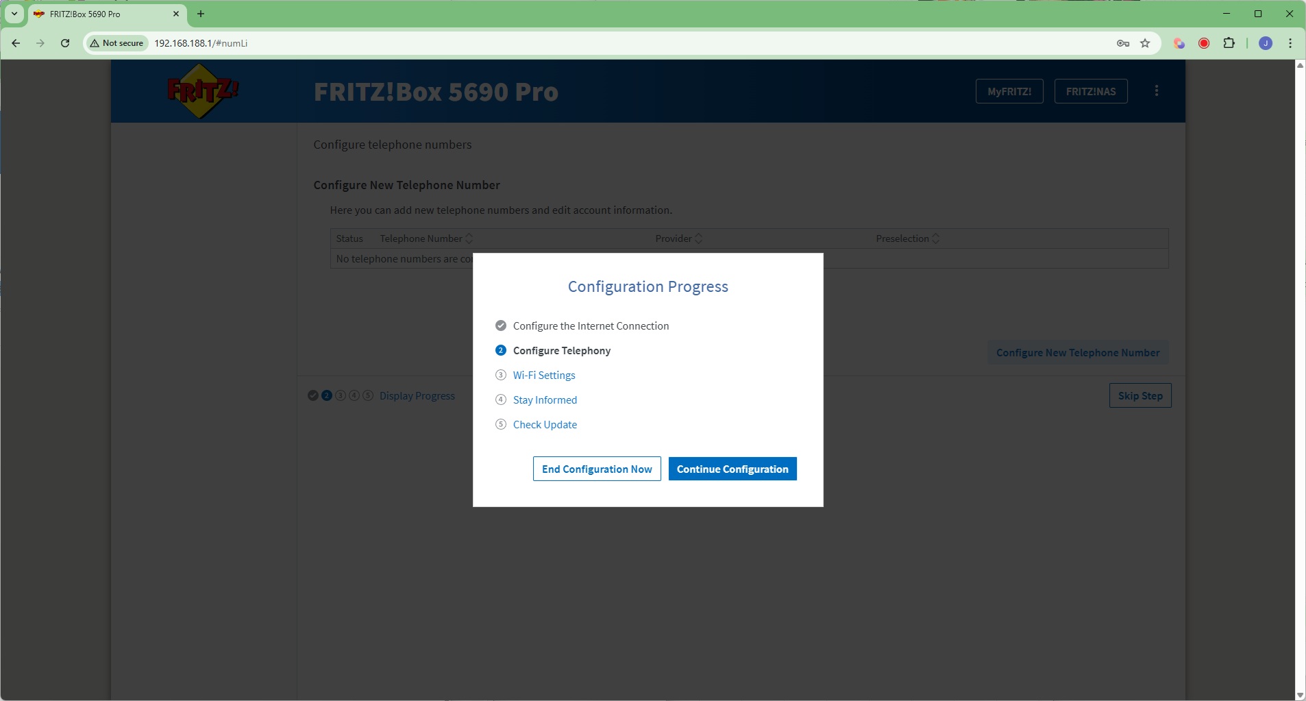 As you can see from the number of screenshots, the setup wizard is rather lengthy. After some initial settings such as region, you're led through connecting your broadband – fibre, DSL or WAN. Then there are screens for the telephony and WiFi. The 5690 Pro will then check for a firmware update, after which you are led to the main Web interface screen.